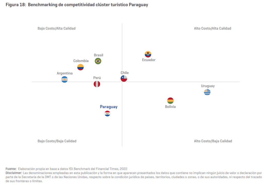 Comparado con 9 país. Paraguay se encuentra en séptima posición respecto al análisis de competitividad y atractividad, encontrándose en el cuadrante de bajos costos, pero también baja calidad del clúster turístico por debajo del promedio de la región juntamente con Bolivia. Dicho ranking está liderado por Chile, Argentina, Colombia y Brasil, como se puede apreciar en la figura.