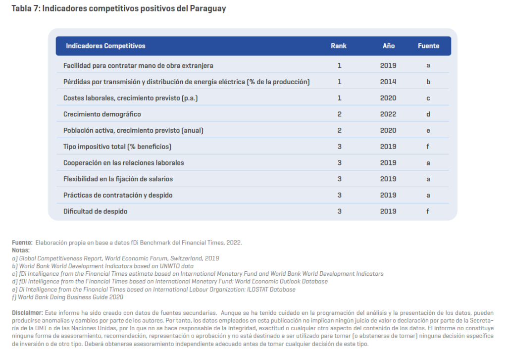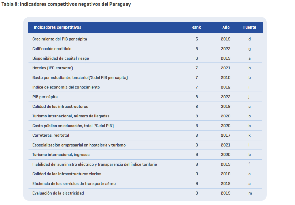 Así también, Paraguay tiene calificaciones bajas principalmente en indicadores de calidad de infraestructura, influyendo la eficacia de los servicios de transporte aéreo, lo cual limita el incremento de turistas internacionales y que está relacionado a la competitividad del clúster. Por otro lado, llama mucho la atención la falta de especialización y capacidades técnicas de la mano de obra y capacidad gerencial del sector turístico. Finalmente, y no menos importante, se tienen debilidades en lo que respecta a inversiones en el sector turístico, sobre todo el limitado track record* de proyectos de inversión extranjera directa (IED) como se pudo apreciar en la segunda parte de este reporte. Esto está acompañado del acceso a financiación para la inversión, incluyendo el capital de riesgo para innovaciones en el sector de travel tech**. La tabla a continuación muestra en más detalle estos indicadores y las fuentes internacionales.