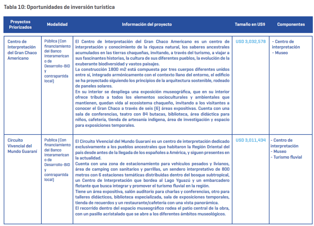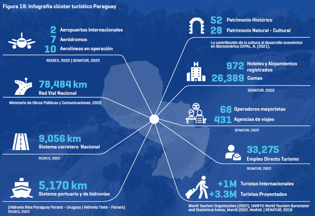 En este sentido, el gobierno del Paraguay ha definido como segundo sector a ser priorizado al turismo receptivo como actividad exportadora. Con un potencial muy importante para el país en la medida en que sigan mejorando la infraestructura de apoyo, la promoción, los destinos y los productos turísticos con calidad internacional. Para todo esto resulta necesario abordar una perspectiva más amplia que involucra distintos aspectos, desde la mejora de la imagen país, la seguridad física, la infraestructura de transporte, comunicación y señalética, la formación de los recursos humanos del sector, entre otros. Según el Plan Nacional de Desarrollo Paraguay 2030, dentro de su eje estratégico 3 Proyección de Paraguay en el mundo.