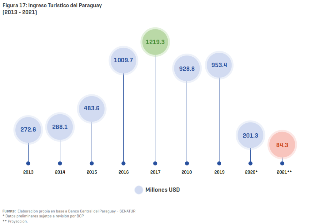 Previo al COVID-19 el turismo se ha posicionado en los últimos cinco años como una de las actividades económicas que más ingreso de divisas genera al país, detrás de rubros tradicionales de exportación como la energía eléctrica, la carne, la soja y sus derivados, según los datos del Banco Central del Paraguay. Este crecimiento sostenido del turismo es el resultado de la implementación del Plan Maestro de Desarrollo Turístico que, desde agosto de 2008, estableció las áreas estratégicas para su desarrollo. Los programas de Posadas Turísticas, Turismo Joven, Empoderamiento de la Mujer, Barrios Turísticos dotan a las comunidades locales de herramientas para fomentar el turismo interno. De acuerdo con la SENATUR, el turismo interno también conserva el ritmo de crecimiento que viene sosteniendo desde hace unos años, con un crecimiento estimado del 8% en 2017. En el año 2019, entre turistas y excursionistas, realizaron turismo interno 1,888,386 personas, generando beneficios económicos a las comunidades en torno a los 211 millones de dólares.