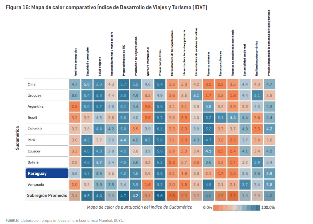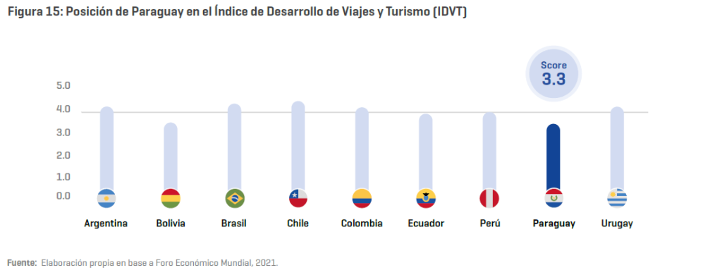 Para analizar de manera general la posición competitiva del Paraguay en lo que respecta el sector turístico. Podemos citar el Índice de Desarrollo de Viajes y Turismo (IDVT) que evalúa y mide el conjunto de factores y políticas que permiten el desarrollo sostenible y resiliencia del sector de los viajes y el turismo, que a su vez contribuye al desarrollo de un país desarrollado por el Foro Económico Mundial (FEM). En el mismo, Paraguay tiene una posición competitiva global del 99 sobre 117 países analizados. Encontrándose en novena posición delante de Venezuela y debajo de Bolivia de los diez países analizados en América del Sur, la cual es encabezada por Chile en que destaca con la posición 34 a nivel global.