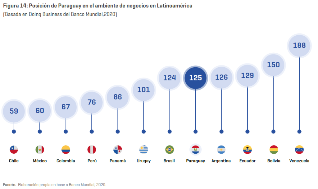 Antes de la discontinuidad del Índice Doing Business producido por el Banco Mundial, se puede apreciar en el 2020 que Paraguay se ubicó en una posición similar a las de sus principales países socios comerciales como son Brasil y Argentina. Su calificación general fue de 125, tan solo detrás de Brasil (124) y por delante de Argentina (126) así como sobrepasando a Ecuador (129) y Bolivia (150), colocando al país en un tier de países con economías emergentes en transición, pero que necesitan mejorar su clima de negocios para pasar a un tier más competitivo todavía, liderados por Chile (59), México (60), Colombia (67) y Perú (76) las cuales encabezan la región en calificaciones.