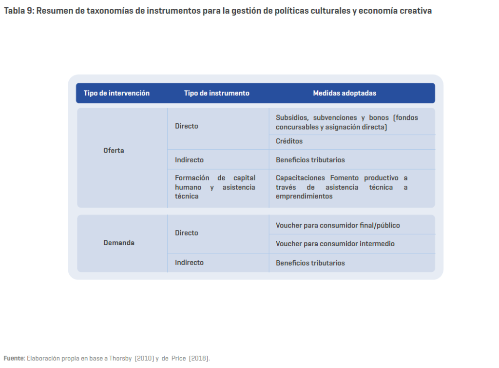 Por tanto, la tabla 9 expone, a manera de resumen, la taxonomía de tipos de intervención pública de fomento a la economía cultural y creativa implementados en los países de América Latina y el Caribe, cuyos instrumentos se pueden enfocar desde la oferta, por ejemplo, a través de un subsidio a la organización de un festival, o promociones de destinos turísticos. Como también desde la demanda; por ejemplo, a través de un subsidio al consumo cultural. También, los autores mencionan desde el enfoque de regulación, promoviendo normativas que alcanzan tanto a la oferta como a la demanda; por ejemplo, leyes asociadas a derechos de autor. Asimismo, se distinguen varios tipos de instrumentos según el énfasis de las políticas públicas, que pueden ser de tipo directo, indirecto, de regulación o de formación de capital humano y asistencia técnica según estudios del BID.