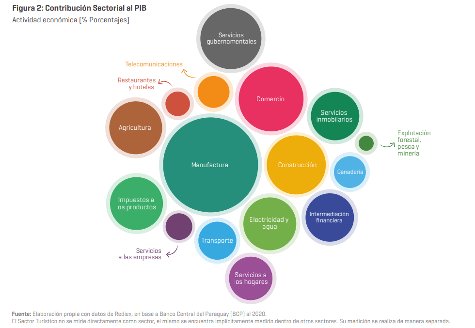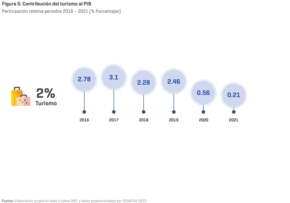 A pesar de la emergente demanda de turistas internacionales en Paraguay, el sector turístico tiene una contribución relativa al PIB de un 1.9% en promedio, considerando los datos desde el 2016 al 202113, pero con un gran efecto en las exportaciones del país representando un 10.8%, por lo que el potencial de crecimiento es una oportunidad estratégica por explorar.