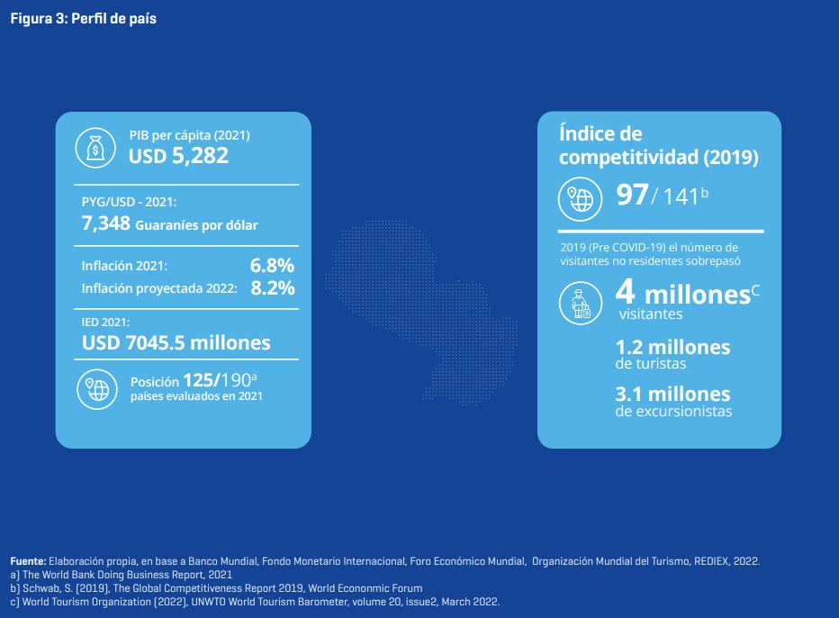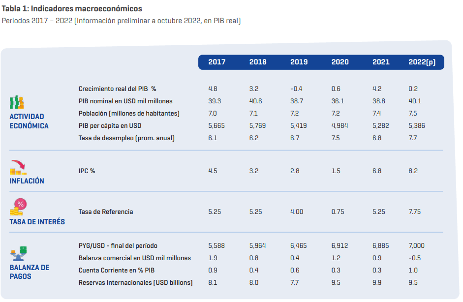 La República del Paraguay es una de las economías más estables de la región. El Banco Interamericano de Desarrollo (BID), menciona en uno de sus reportes que Paraguay ha sido una de las economías de más alto crecimiento en la región durante la última década. Según datos del Fondo Monetario Internacional (FMI) el crecimiento del PIB fue de un 4.2% en 2021, impulsado principalmente por el consumo de los hogares.