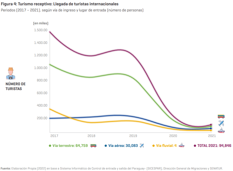 Paraguay es un destino emergente con mucho potencial, de acuerdo con los datos de la Organización Mundial del Turismo (OMT), el 2019 previo al brote de COVID-19, el número de visitantes no residentes a Paraguay sobrepaso los 4 millones de visitantes (1.2 millones de turistas 12 y 3,1 millones de excursionistas). Siendo el 2017 el año con más visitantes internacionales, alcanzando 4.7 millones (1.6 millones de turistas y 3.2 millones de excursionistas).